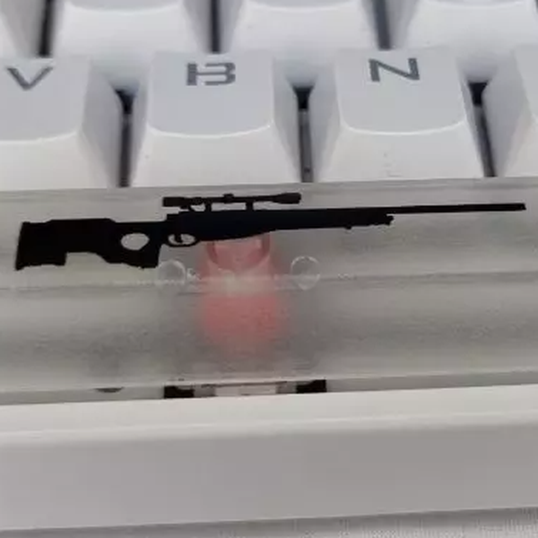 Barra de espaço personalizada para teclado mecânico tamanho 6.25u produzida em plástico ABS injetado, garantia de alta resistência nos encaixes e durabilidade. Barra de espaço na cor branca com arma AWP em preto, transpassa luz pela tecla toda, lindo efeito no teclado!