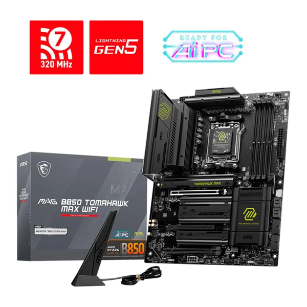 A MAG B850 TOMAHAWK MAX WIFI foi criada para gamers. A longevidade e estabilidade da sua construção e suas funcionalidades incentivam os usuários a montarem seu próprio PC. Equipada com Tecnologia Killer Wi-Fi 7 e LAN 5G, USB de 20Gbps, PCIe 5.0, Alimentação PCIe Suplementar e os exclusivos recursos EZ DIY, esta placa-mãe está mais do que preparada para entrar no campo de batalha de mãos dadas com os processadores AMD Ryzen™ da Série 9000.