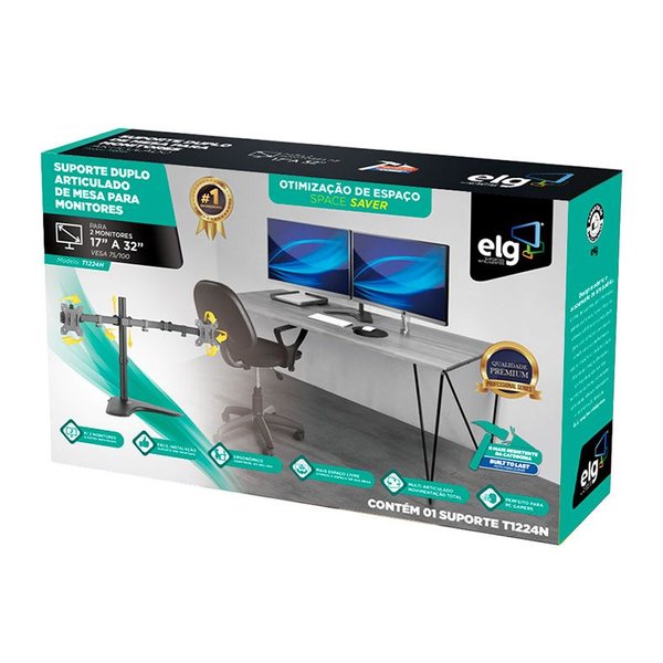 Suporte Duplo Articulado de Mesa Para 2 Monitores ELG. 17 Pol. a 32 Pol., Preto, T1224N