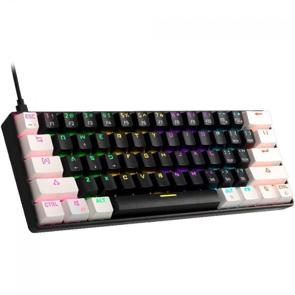 TECLADO MECÂNICO GAMER GAMDIAS AURA GK2, RGB, SWITCH BROWN, ABNT2, 60%, BLACK/WHITEO 61 Key AURA GK2 é um teclado mecânico econômico que vem em teclas duplas em preto e branco com interruptores mecânicos táteis, retroiluminação colorida multizona vibrante com 9 efeitos de iluminação integrados e um cabo USB tipo C para A para máxima portabilidade