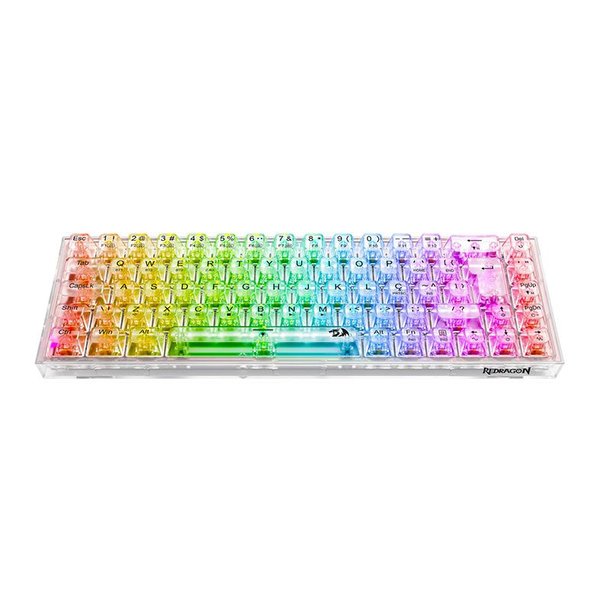 O teclado possui estrutura totalmente transparente, incluindo switches e keycaps, permitindo que a iluminação RGB se destaque de forma intensa e uniforme. Esse design maximiza o efeito visual dos LEDs, sem barreiras que limitem o brilho ou a personalização de cores.